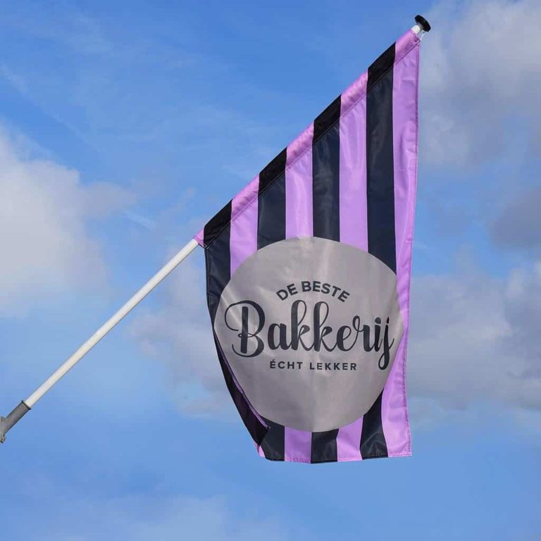 Winkelvlaggen zijn een bekend product dat je veel terug ziet in de winkelstraten, op markten, gebakskramen en evenementen. Ze worden ook vaak kioskvlaggen genoemd, refererend aan de kleine winkels. Deze vlaggen worden met een vlaggenstok en houder aan de wand of gevel geplaatst. Deze vlaggenstokken en houders kun je eventueel direct mee bestellen tijdens het samenstellen van jouw winkelvlag. Deze stokken staan in een hoek van 45º en onze winkelvlaggen zijn dan ook zodanig geconfectioneerd dat ze mooi recht naar beneden hangen.